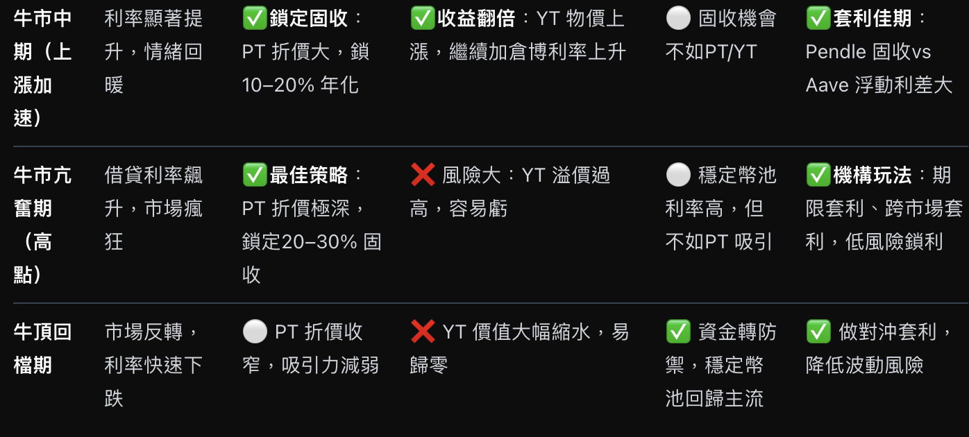 - 牛市上升期:市场风险偏好逐步恢复,借贷需求和利率仍处在低位,Pendle 上的 YT 定价相对便宜。此时,𧹒入 YT 相当于押注未来收益率上升,一旦市场进入加速上涨阶段,借贷利率和 LST 收益都会抬升,从而推高 YT 的价值。这是典型的高风险高回报策略,适合𫖸意提前布局、捕捉牛市放大收益的投资者。