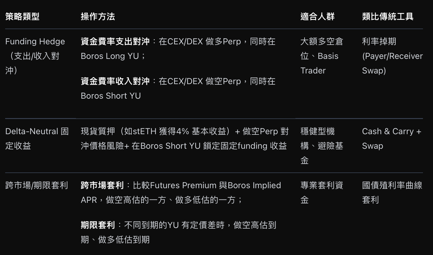 Boros 将资金费率(Funding Rate)这一浮动变数资产化,相当于把传统金融的 利率掉期(Interest Rate Swaps, IRS) 与 基差交易(Basis Trading / Carry Trade) 引入 DeFi,使资金费率从不可控的成本项转化为可配置的投资工具。其核心凭证 Yield Units (YU) 支撑了三类主要策略路径:投机、对冲与套利。