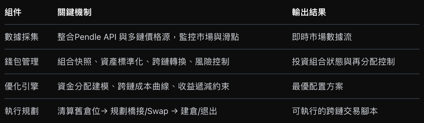 - 资料采集(Data Collection):即时抓取 Pendle 多链市场资料,包括活跃市场、APY、到期时间、流动性和跨链桥费用,并建模滑点与价格冲击,为优化引擎提供精準输入。
