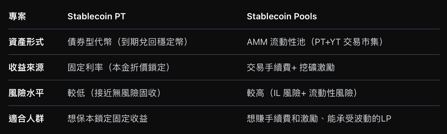 需要特别说明的是,在 Pendle 的稳定币资产中,PT(本金代币,固定收益型仓位) 相当于链上债券,𧹒入时通过折价锁定固定利率,到期可 1:1 兑回稳定币,收益稳健、风险较低,适合追求确定性回报的保守型投资者;而 Stablecoin Pool(流动性挖矿型仓位) 本质上是 AMM 做市,LP 收益来自手续费与激励,APY 浮动较大,同时伴随无常损失风险,更适合能承受波动、追求更高收益的主动型投资者。在交易量活跃且激励丰厚的市场中,Pool 收益有可能显著高于 PT 固收;而在交易冷清、激励不足时,Pool 收益往往低于 PT,甚至可能因无常损失出现亏损。