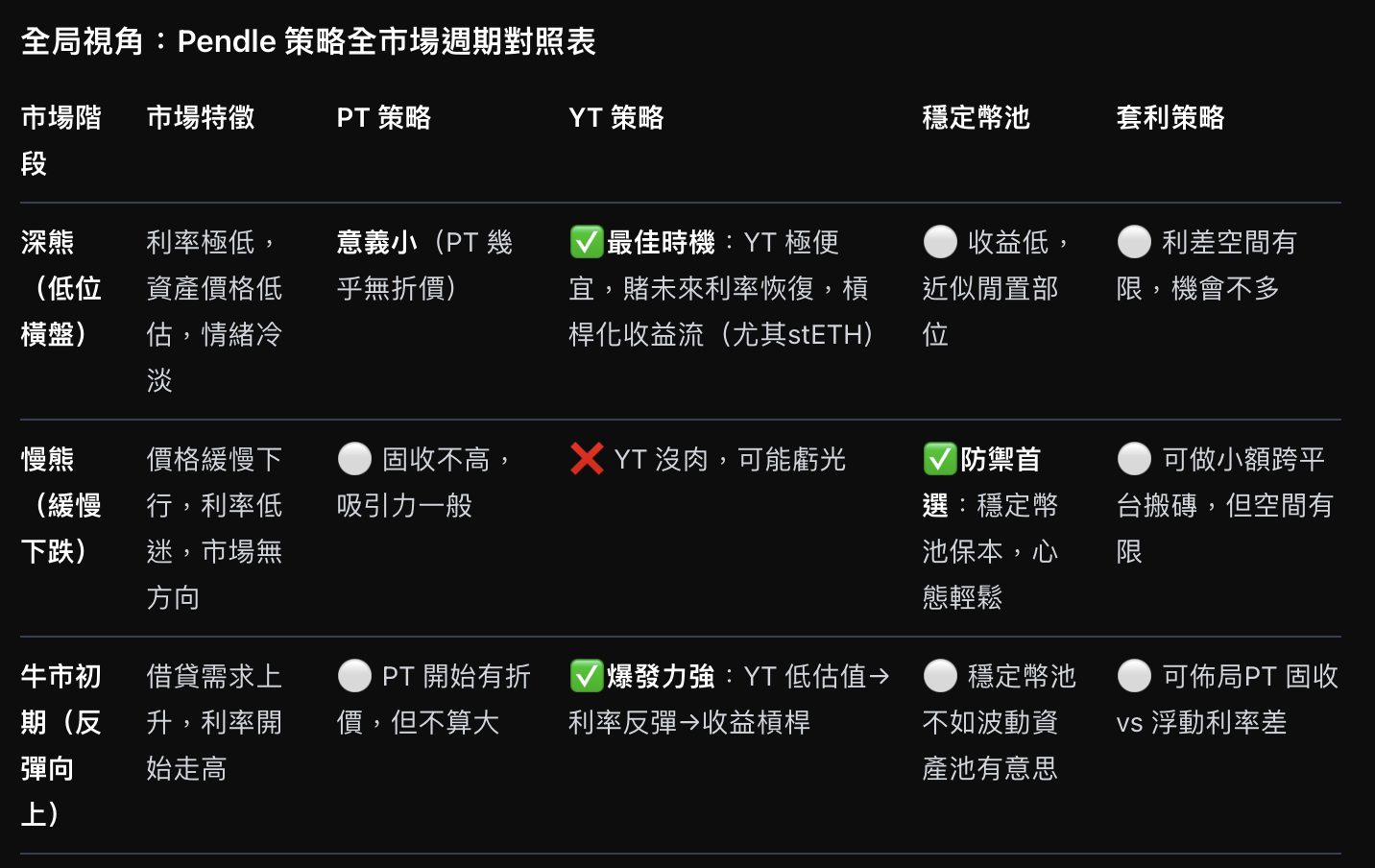 - 基于市场周期的全景化策略覆盖 —— 将 Pendle 在牛熊不同阶段的交易策略模组化,覆盖 YT、稳定币池,甚至做空和套利等更高阶的玩法;