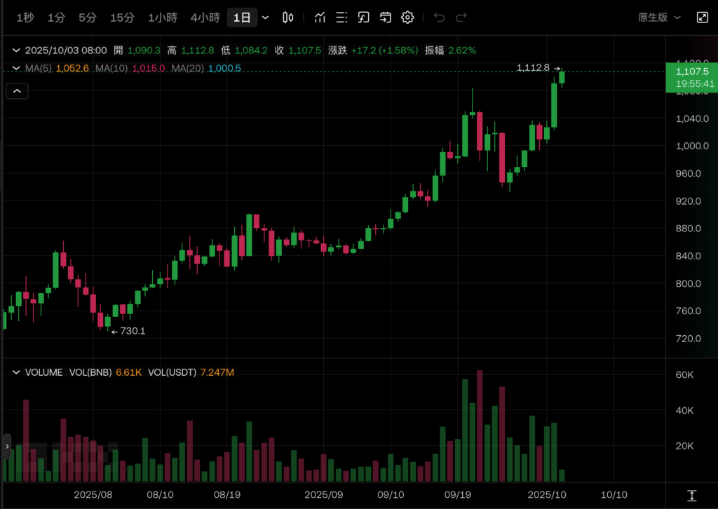币 安平台币 BNB 在今(3)日突破 1,100 美元,再度创下历史新高,截稿前最高触及 1,112.8 美元,让空军损失惨重。如果自年初的 500 美元低点起算,BNB 迄今报酬率约 220%。