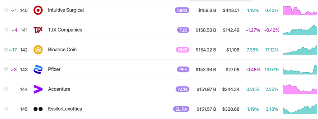 目前据 8marketcap 数据 显示,BNB 以 1,542 亿美元的市值,超越製药大厂辉瑞(Pfizer)埃森哲(Accenture)、先锋集团等知名企业,成为全球排名第 142 大的资产。