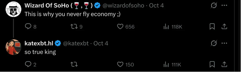 Wizard Of SoHo 调侃道:"这就是为什么你永远不要坐经济舱 ;)"Kate 回应:"说得对,大佬。"