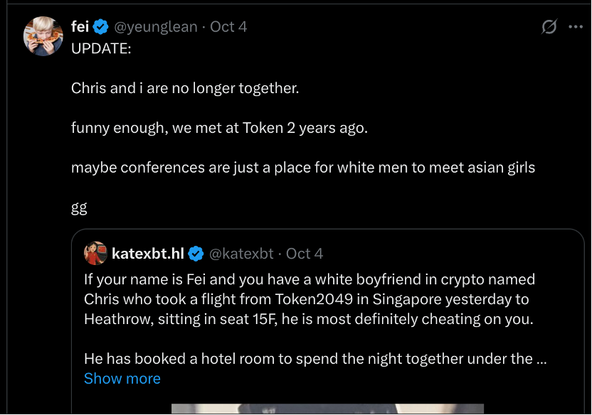 更戏剧性的是,Chris 的女友 Fei (@yeunglean) 当天就看到了这条帖子。同天, 她发布分手声明:"更新:Chris 和我刚分手了。有趣的是,我们两年前在 Token 头一次认识;也许行业会议只是白男认识亚洲女孩的地方。gg(游戏结束)。"