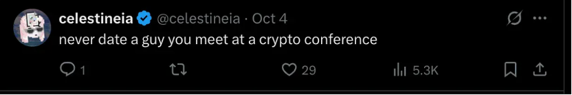 用户 celestineia 给出了直白的建议:"永远不要和在加密会议上遇到的男人约会。"