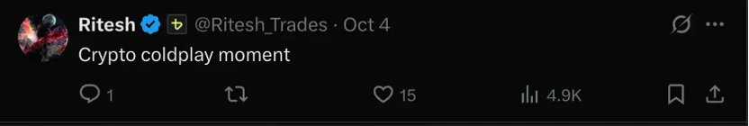 Ritesh (@Ritesh_Trades) 评价:"加密圈里的 Coldplay 时刻。"