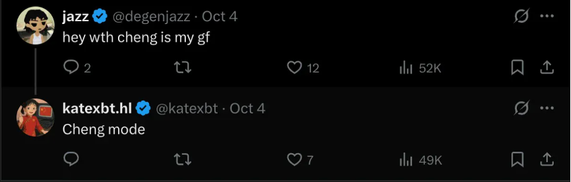 用户 jazz (@degenjazz) 说:"卧槽啊 Cheng 是我女朋友",谁也不知道他是不是在开玩笑;