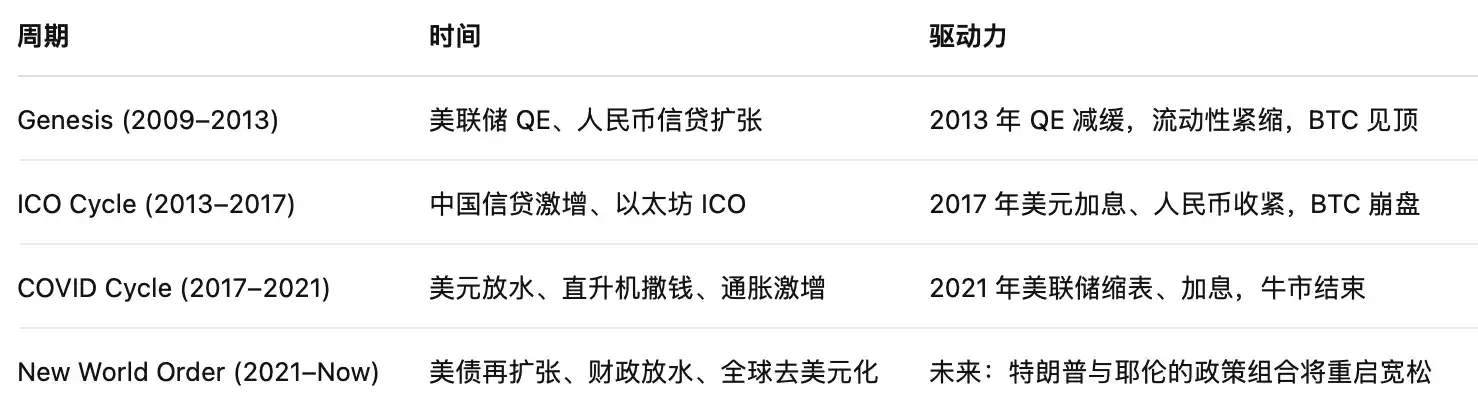 Arthur Hayes 在最新文章《Long Live the King》中系统阐述了比特币价格周期的演化逻辑,提出「四年减半周期已死,流动性周期当立」的观点。他指出,历史上三次比特币牛熊转换,实质都源于美元与人民币流动性的扩张与收缩,而非区块奖励变化。2009–2013 年,美联储首次开启量化宽松(QE)与中国信贷刺激,共同推动了比特币的诞生与首次牛市;2013–2017 年,中国信贷激增引爆 ICO 热潮,直至货币收紧泡沫破裂;2017–2021 年,特朗普与拜登时代的「大放水」制造了史上最大流动性扩张,推动比特币创出历史新高。