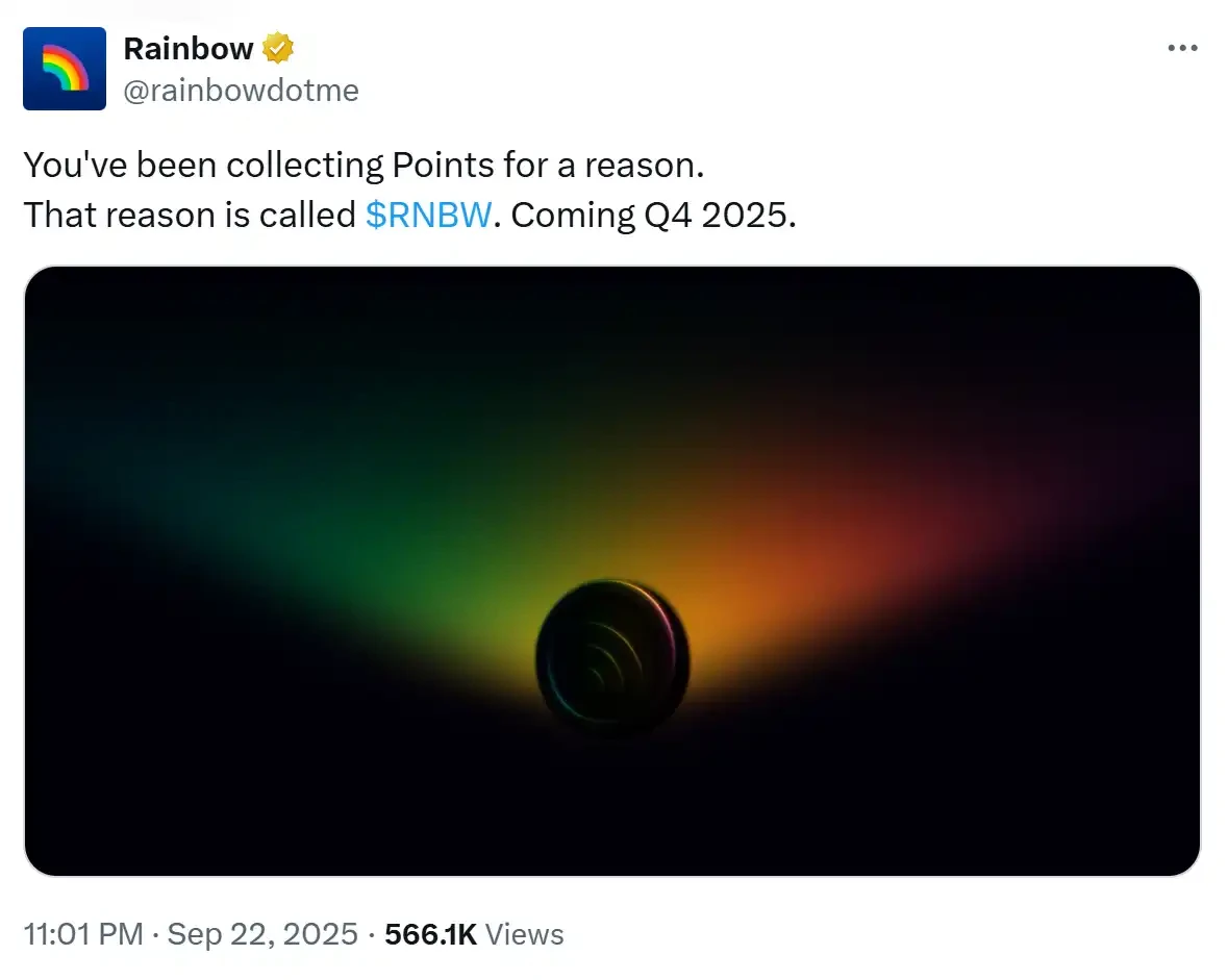 9 月 23 日,据官方消息,Web 3 移动端钱包 Rainbow 宣布将于 Q 4 发行代币 RNBW,具体空投和分配细节将由官方 Twitter 账号后续公布。