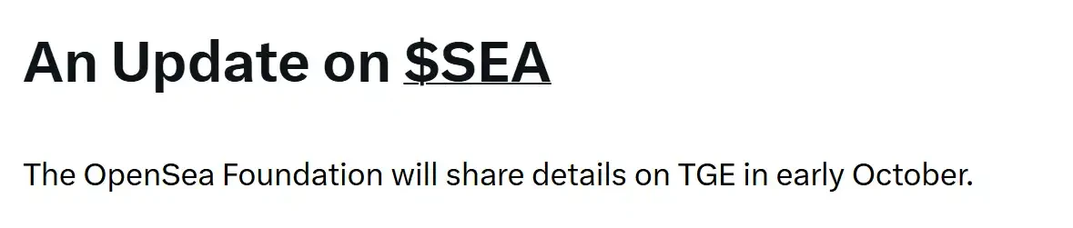 9 月 9 日,OpenSea CMO Adam Hollander 于发表在 Twitter 上的文章中透露,OpenSea 基金会将在 10 月初发布 TGE 的具体细节。