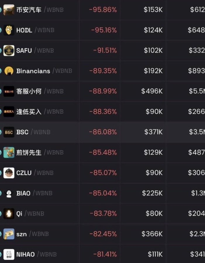 一场突如其来的暴跌席卷了 BNB Chain 上的 Memecoin 市场。多个热门代币在周四暴跌超过 80%,其中客服小何、币安汽车等中文名代币跌幅达 90%。