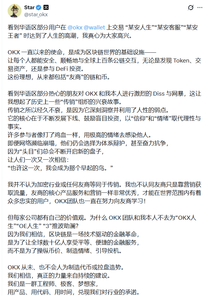 OKX 创始人徐明星对此发表了看法,他虽未直接指责友商,但暗示了某些行为可能利用了人性弱点。他表示:「传销之所以经久不衰,是因为它深刻洞察并利用了人性的弱点。它的核心在于不断发展下线、鼓励盲目投资,以『信仰』和『情绪』取代理性与事实。」 徐明星强调 OKX「从未、也不会人为制造代币或拉盘造势」,这与 BNB Chain 上的现象形成了鲜明对比。这种差异或许揭示了两家交易所对 Memecoin 热潮的不同态度。