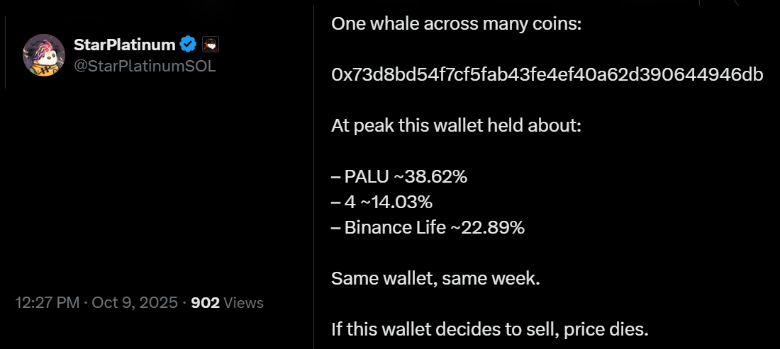 X 用户 StarPlatinumSOL 声称,单个钱包在峰值时期控制了 PALU 近 39% 的供应量,同时还控制了 Binance Life 的 23% 和 4 代币的 14%。这种高度集中持仓使巨鲸能够轻易操纵市场价格。
