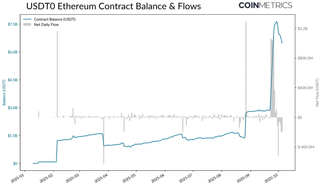 在 9 月 25 日推出 Plasma(一个为稳定币优化的 Layer-1 区块链)之后,锁定在 USDT 0 以太坊合约中的 USDT 供应量从 28 亿美元激增至 77 亿美元。凭借零费用的 USDT 转账、稳定币作为燃料费以及高吞吐量设计,Plasma 迅速吸引了超过 60 亿美元的 USDT 0 供应量,目前稳定在约 42 亿美元。