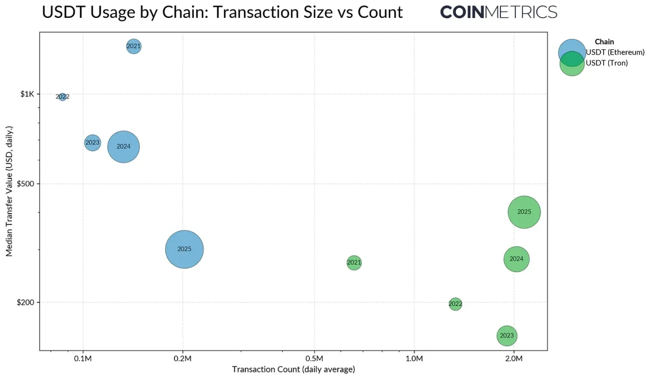 - 以太坊和波场在 USDT 活动中的角色正在演变,波场在高频、低成本的支付领域保持领先地位,而以太坊费用的下降和流动性的增强推动了更广泛的零售和结算应用。