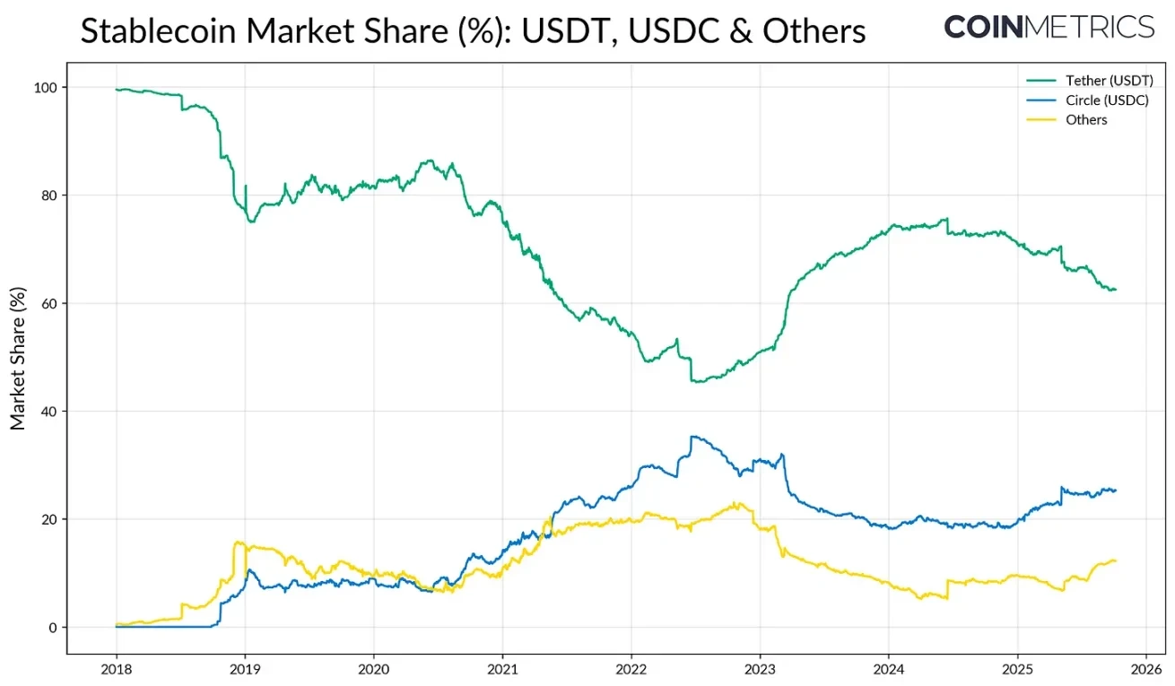 - 随着新法规和竞争动态重塑稳定币市场,并在合规性和收益分配方面出现差异化,USDT 的主导地位正在下降。