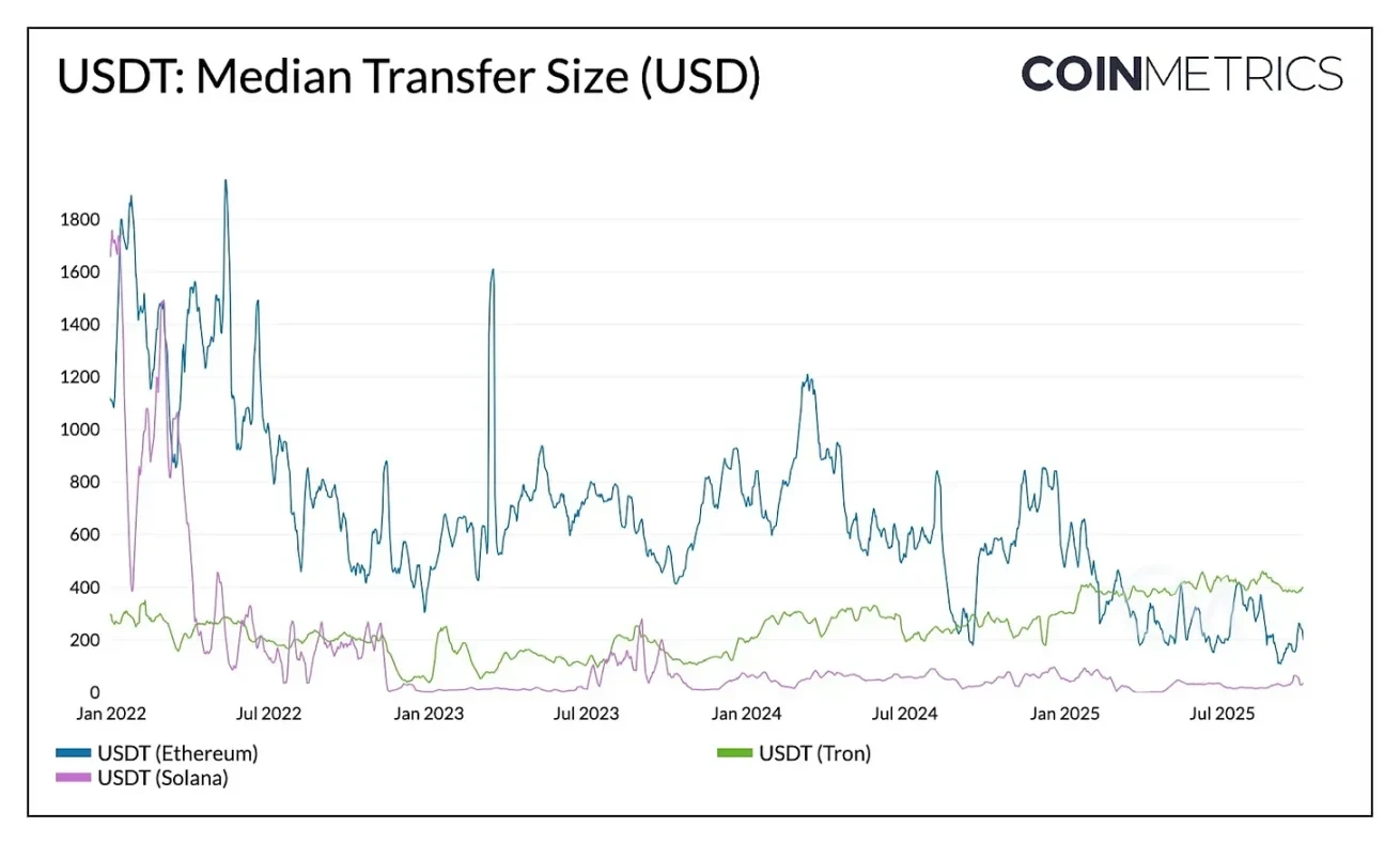 在 Dencun 和 Pectra 升级之后,以太坊的平均交易费用已降至 1 美元以下,使得小额转账的频率得以提高。以太坊上的中位转账金额从 2023 年的超过 1000 美元下降到 2025 年中的约 240 美元,而波场的中位金额则有所上升。这种动态使以太坊更接近于曾经波场独有的活动类型。
