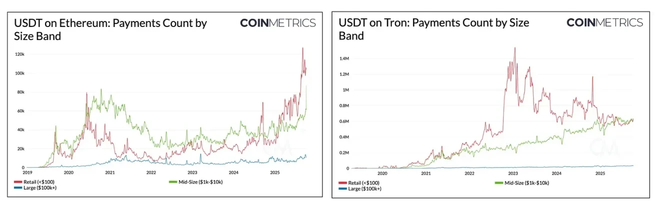 这一趋势在跨区块链的 USDT 支付构成中也显而易见。在波场上随着中等规模流量的势头增强,零售支付和中型转账之间的差距已经缩小。在以太坊上自 2024 年以来,零售(<100 美元)和中型(1 千 -1 万美元)支付的数量急剧增长,而大额(10 万 -100 万美元)转账保持稳定。这表明,随着网络变得更加易于访问,USDT 的使用正朝着小规模活动多样化。