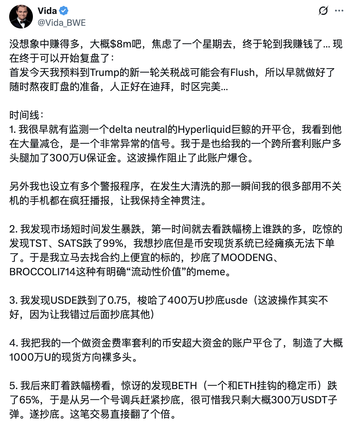 行情相对修复后,许多 KOL 都开始在 X 明牌晒单盈利状况,比如 Vida( @Vida_BWE )直接披露一夜盈利大概在 800 万美元左右。