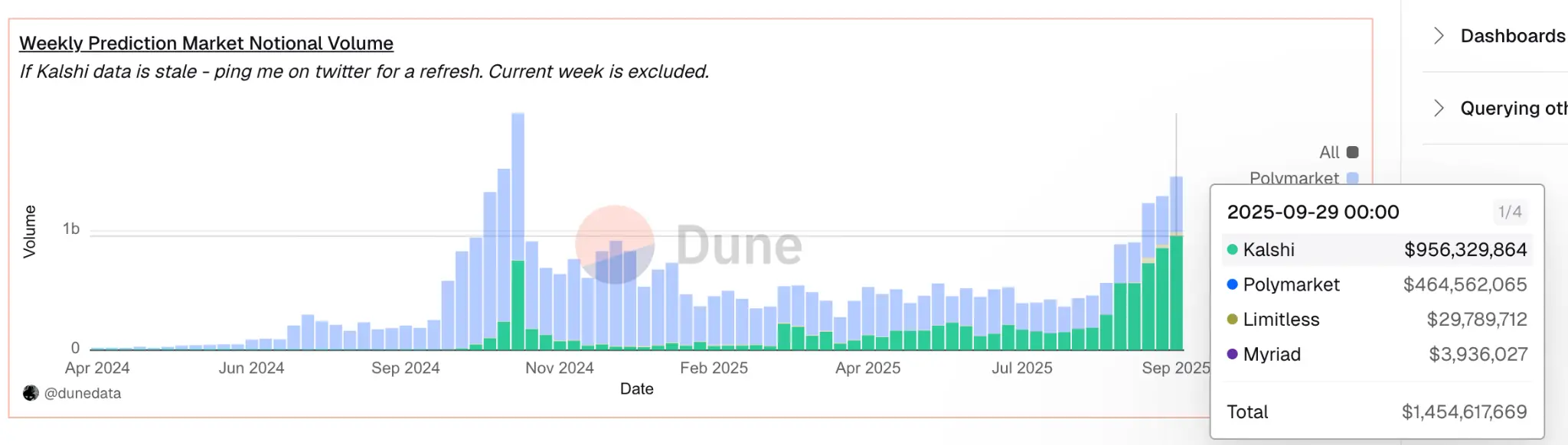 根据 Dune Analytics 的数据,Kalshi 最近超越 Polymarket,占据了全球市场份额的 60% 以上,相较于去年约 3 亿美元大幅攀升,Kalshi 的年度交易量已增长至约 500 亿美元。