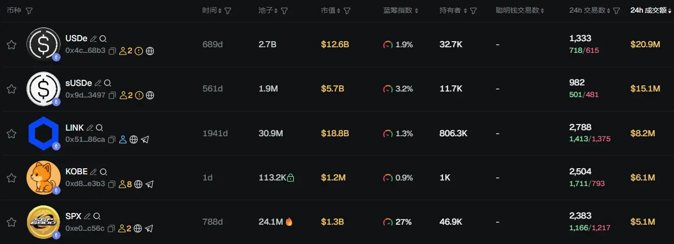 过去 24h ETH 热门代币前五依次为:USDe、sUSDe、LINK、KOBE、SPX