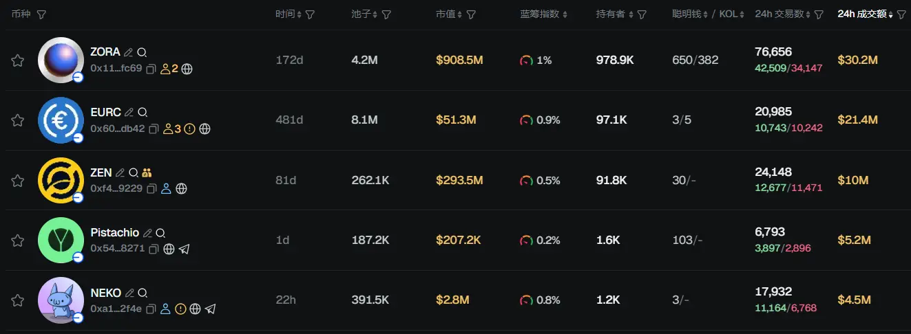 过去 24h Base 热门代币前五依次为:ZORA、EURC、ZEN、Pistachio、NEKO
