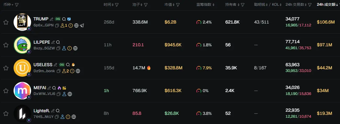 过去 24h Solana 热门代币前五依次为:TRUMP、LILPEPE、USELESS、MEFAI、LighteR.