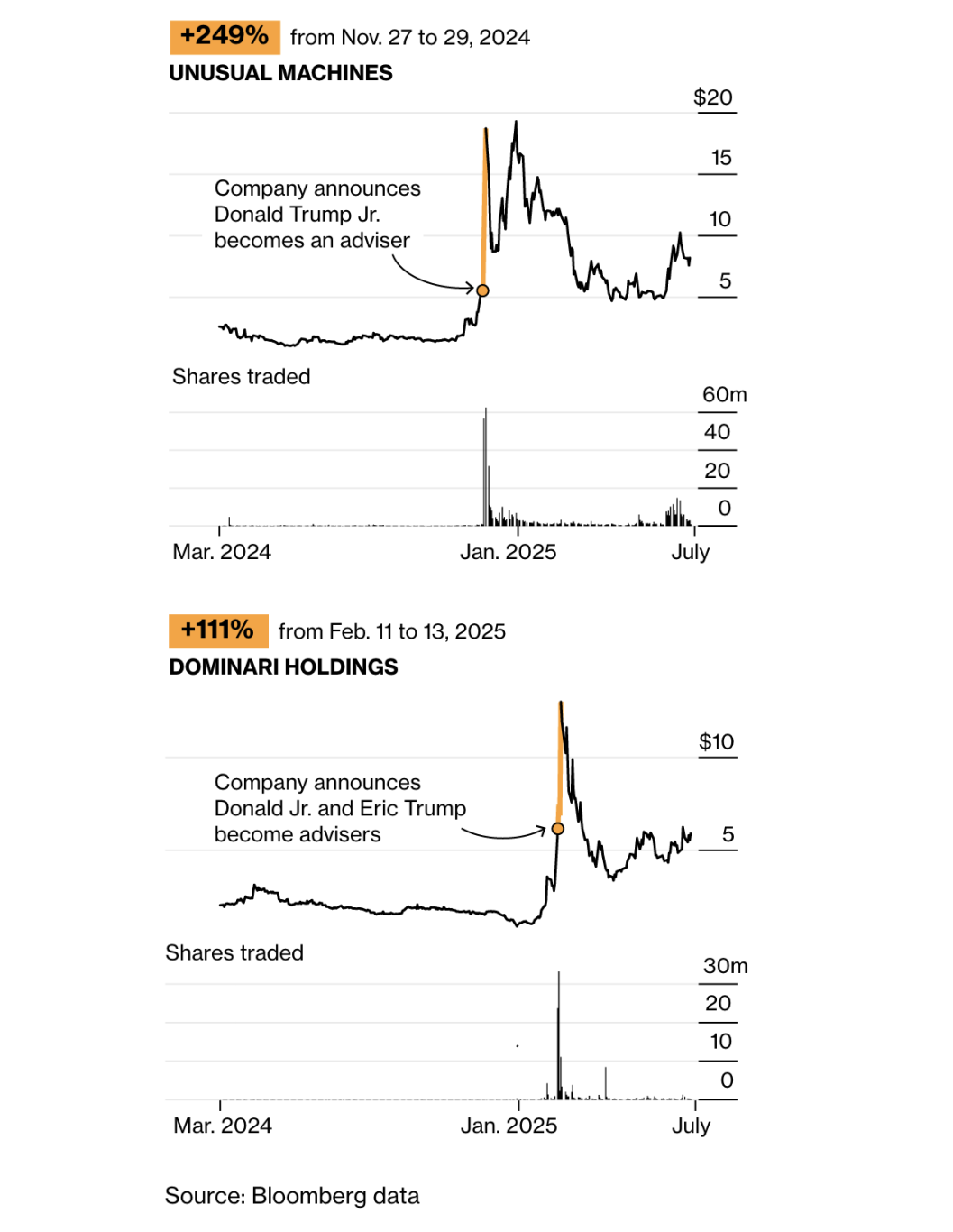 特朗普的名字,恰好能为股票推手带来他们最渴望的热度。以奥兰多一家亏损的无人机公司 Unusual Machines Inc. 为例,2024 年大选后三周,有消息称小唐纳德・特朗普将担任该公司付费顾问兼投资者,这一合作正是由 Wool 促成。证券文件显示,该公司股价在三天内涨幅超两倍,为这位总统长子带来了 440 万美元的账面收益。