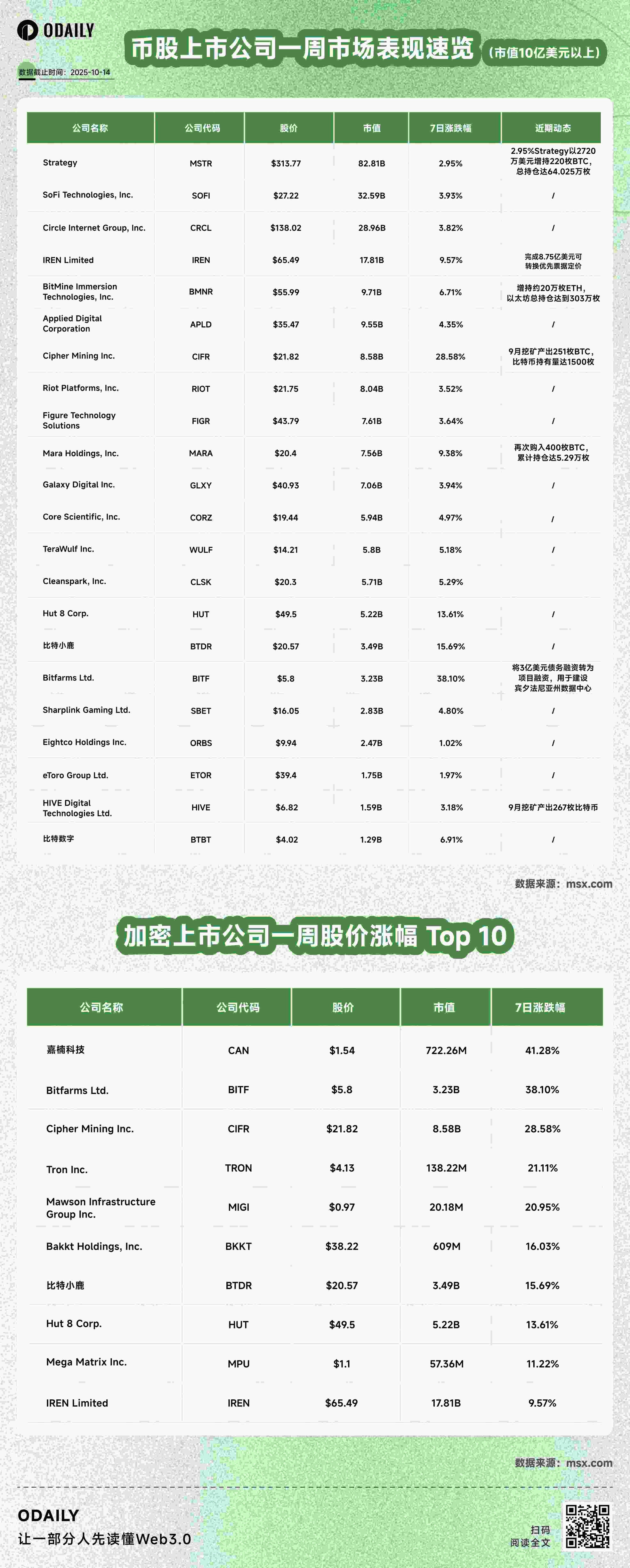 编者按:尽管上周六市场经历了一次多重因素的极速闪崩,但作为 DAT 策略的践行者,诸多执行囤币策略的上市公司不仅没有割肉止损,反而投入了更多资金抄底,足见传统金融领域对于加密市场后续走向的信心。除此以外,还有不少上市公司陆续完成融资、股权派息并买入各类山寨币。目前来看,上市公司仍然是市场买盘的重要力量。以下为 Odaily 星球日报总结整理的上周币股市场信息, 所有美股数据皆来自 msx.com 。