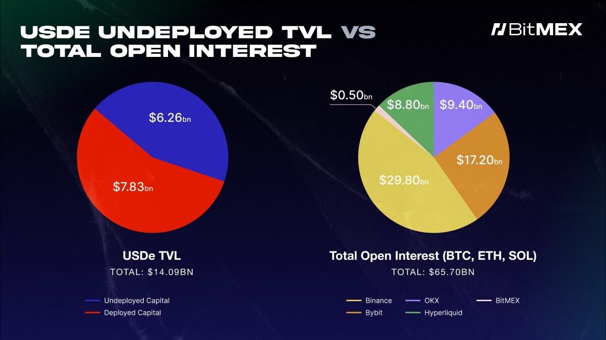 图 2:2025 年 9 月 25 日 Ethena (USDe) 锁定总价值与各大加密货币交易所 BTC、ETH 和 SOL 的总未平仓合约量