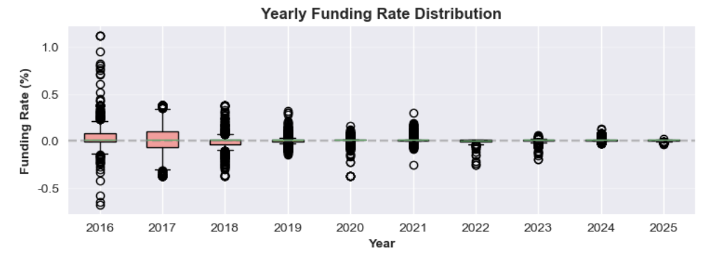 图 1:2016 年至 2025 年年度资金费率分布