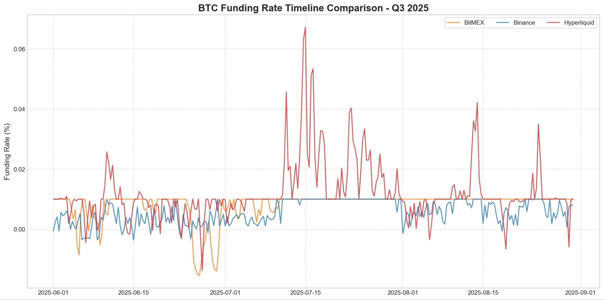 图 3:2025 年第三季度各交易所 BTC 资金费率的差异走势。Hyperliquid(红色)表现出显著的波动性,且急剧上涨通常超过 0.01% 的上限。相比之下,BitMEX(橙色)和币安(蓝色)提供了更稳定的利率环境。