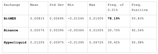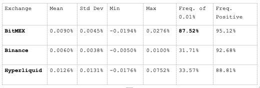 上图清晰地显示了 BitMEX 与 Hyperliquid 和币安等其他交易所在资金费率稳定性方面的差异。