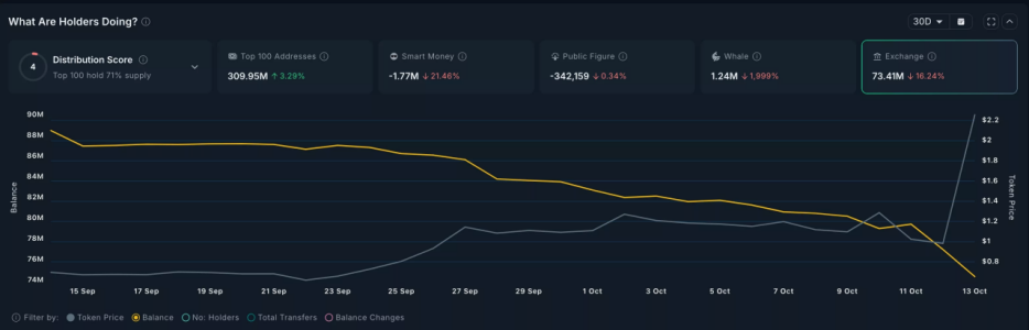 Nansen 数据显示,SNX 的 CEX 储备量降至一个月以来的最低点,仅余 7,341 万枚,较 9 月下滑约 16%。CEX 的储备量下降限制了即时流动性,在市场情绪高涨的环境下进一步放大了价格的上行波动。