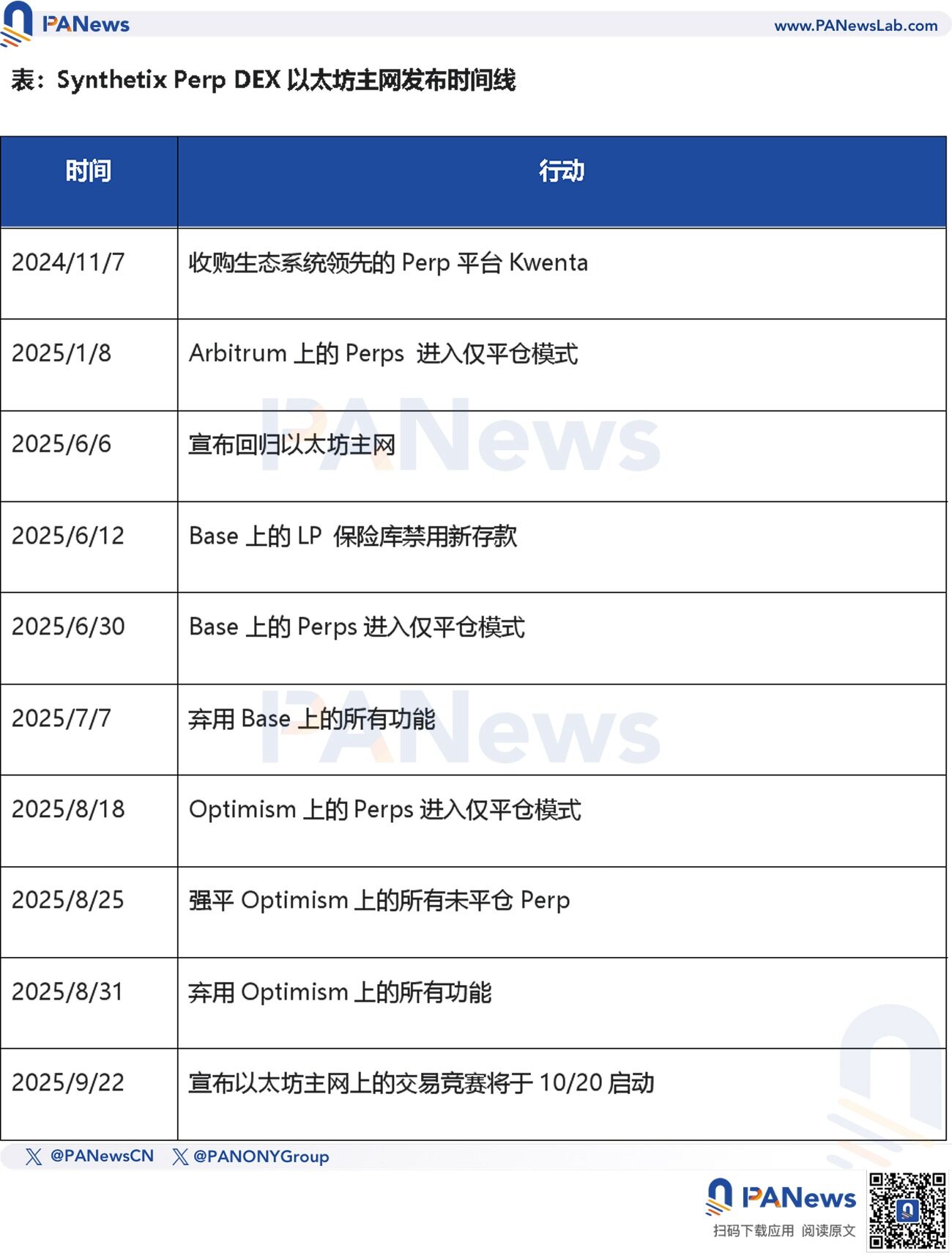 Synthetix 于 2024 年下半年投票决定终止 L 2 部署。自 2025 年初以来,其就在逐步弃用 L 2 网络,直至 9 月完全关闭,全面转向以太坊。Synthetix 宣布 Perp DEX 将于 Q 4 上线主网,同时为配合 V 3 的启动,将举办一场激励高达 100 万美元的交易竞赛,进一步刺激社区参与度与交易热度 。