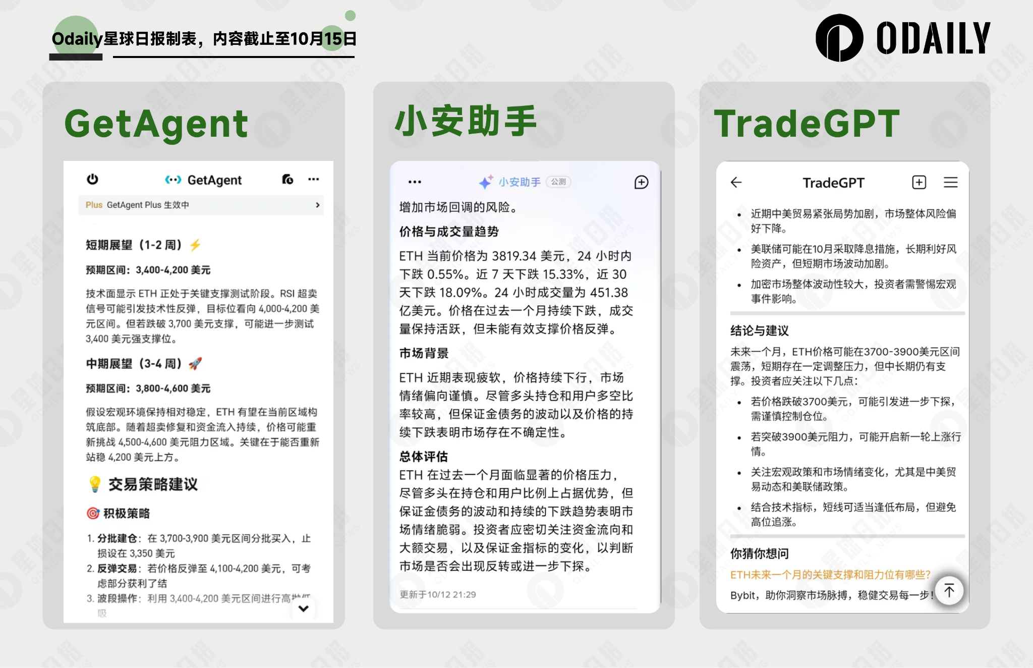 GetAgent 再次给出了明确的点位,但判断基准由普适规律变为了技术分析,并且同样转变为双向方案,但差异在于 GetAgent 给出了更为明确的交易指引,包括分批抄底区间、明确的止盈区间等详细方案;小安助手则再次复述了大量历史数据,但没有具体的操作指引;而 TradeGPT 则再次给到了“压力位-支撑位”的多空双向方案。