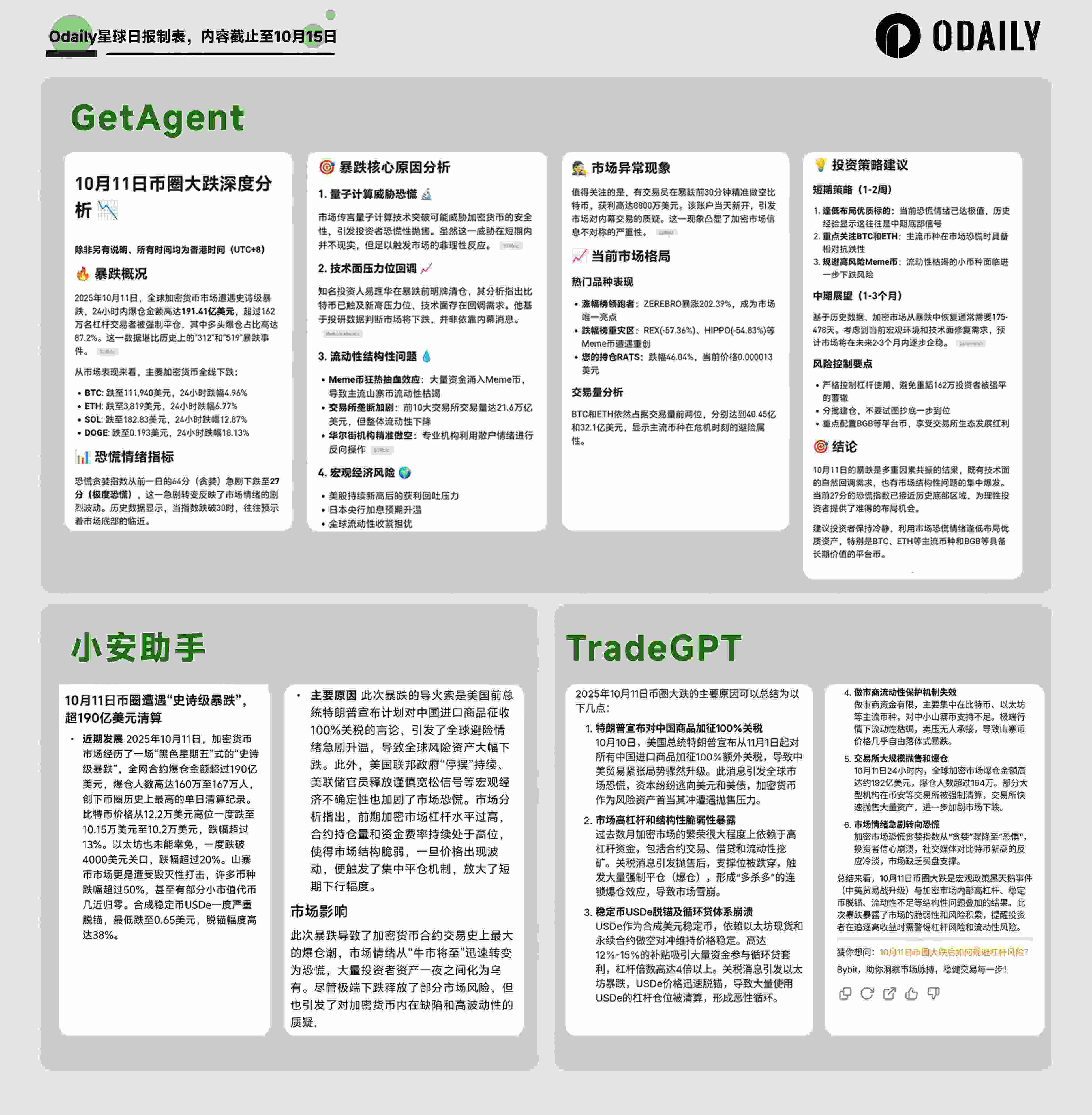 这些 AI 助手能否提供真实、可靠的信息,能否为用户提供具有 Alpha 价值的洞见 ?亦或者是仍在初期的概念性试水产品?它们在真实场景中的表现如何?为了验证这一问题,我们选取了三款上线已有一定时间的 AI 助手——币安的小安助手、Bitget 的 GetAgent、Bybit 的 TradeGPT,围绕 10 月 11 日加密市场的暴跌事件进行一轮深度测评,旨在探究其可用性。