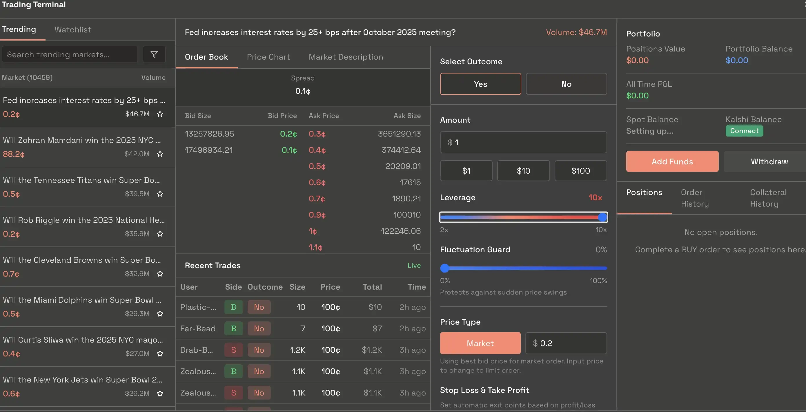 Flipr 的另一功能是引入了预测市场罕见的杠杆功能。一般来说,Polymarket 或 Kalshi 这类两元期权平台的下注都是用$0-$1 价格购买合约,到期按结果兑现$1,无额外杠杆。而 Flipr 允许用户开设高达 10 倍杠杆的头寸。