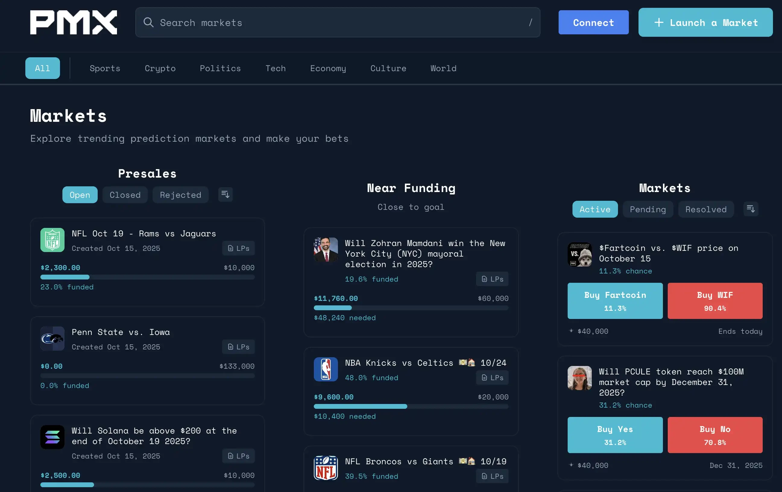 今年 5 月 PCULE 上线时市值一度达到约 1,500 万美元,并在 6 月赢得了 AllianceDAO 56 万美元的种子投资。而在 10 月 1 日 PCULE 正式改名 PMX,团队也宣布将上线一个无许可发选题的预测市场(类似于 Memecoins 的内盘,上线外盘后可供投注)。