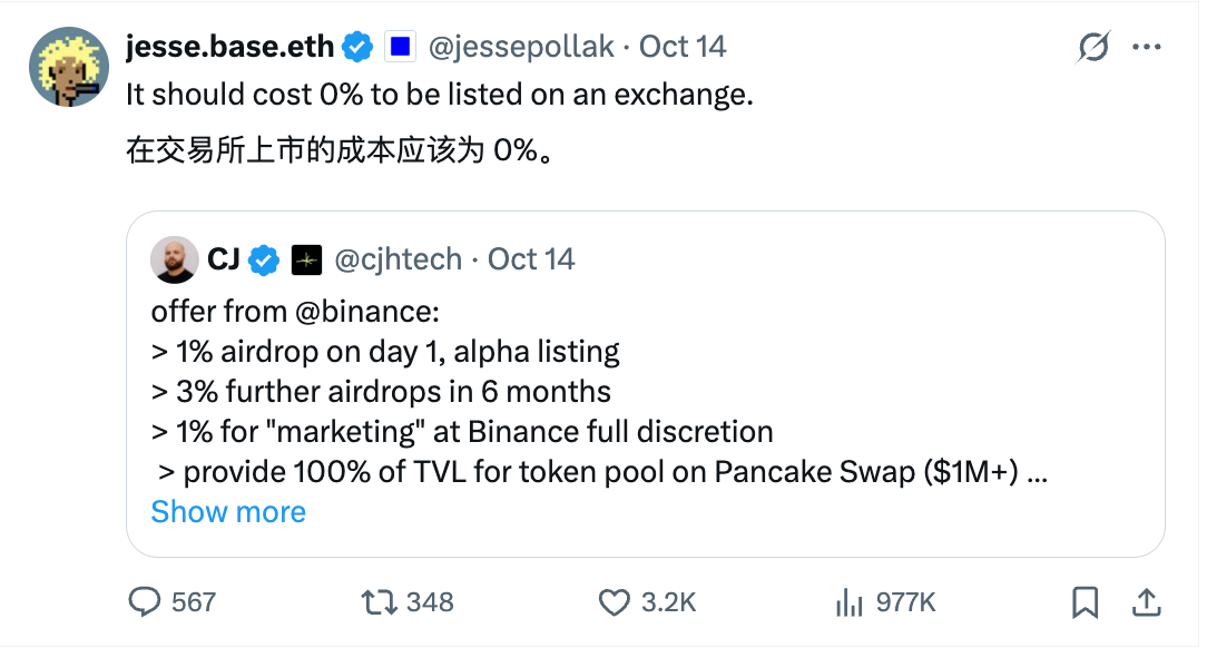 Jesse 对这一推文也给出了自己的支持, 再次强调 CEX 上币费应当为 0。