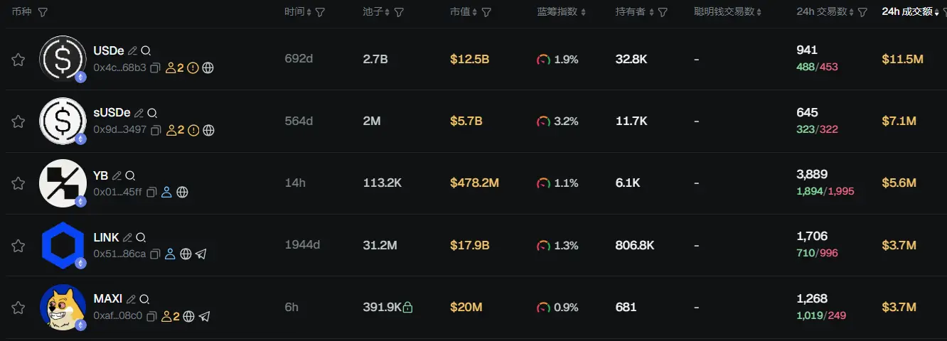 过去 24h ETH 热门代币前五依次为:USDe、sUSDe、YB、LINK、MAXI