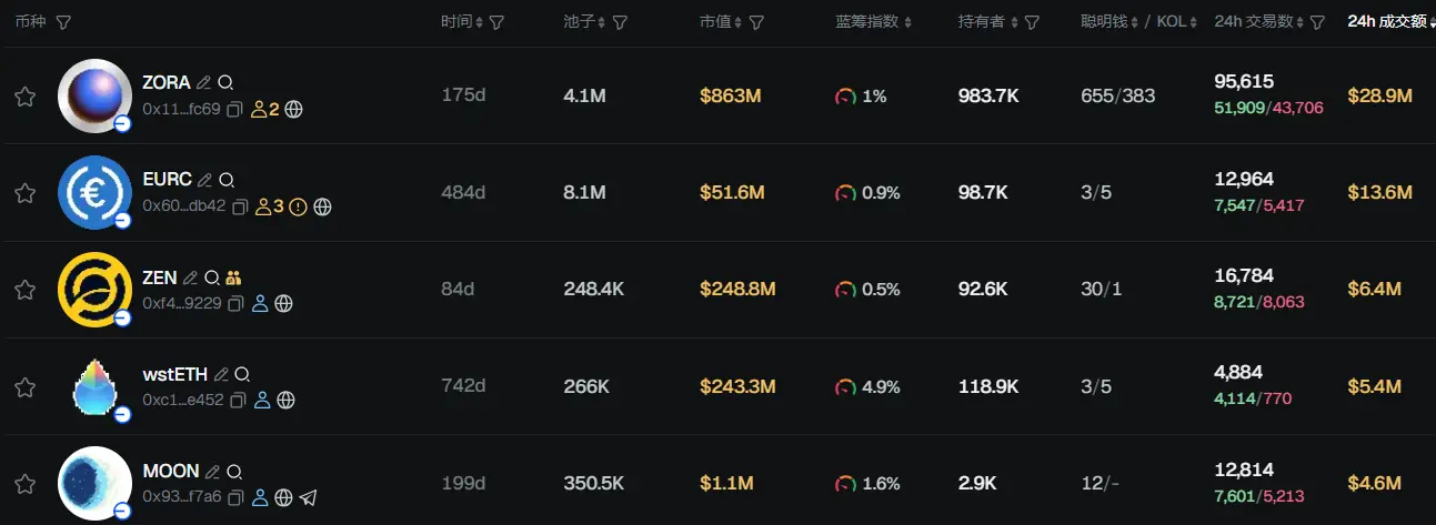 过去 24h Base 热门代币前五依次为:ZORA、EURC、ZEN、wstETH、MOON