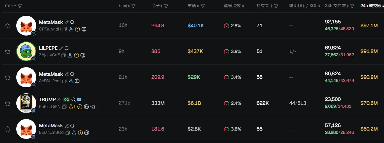 过去 24h Solana 热门代币前五依次为:MetaMask、LILPEPE、MetaMask、TRUMP、MetaMask