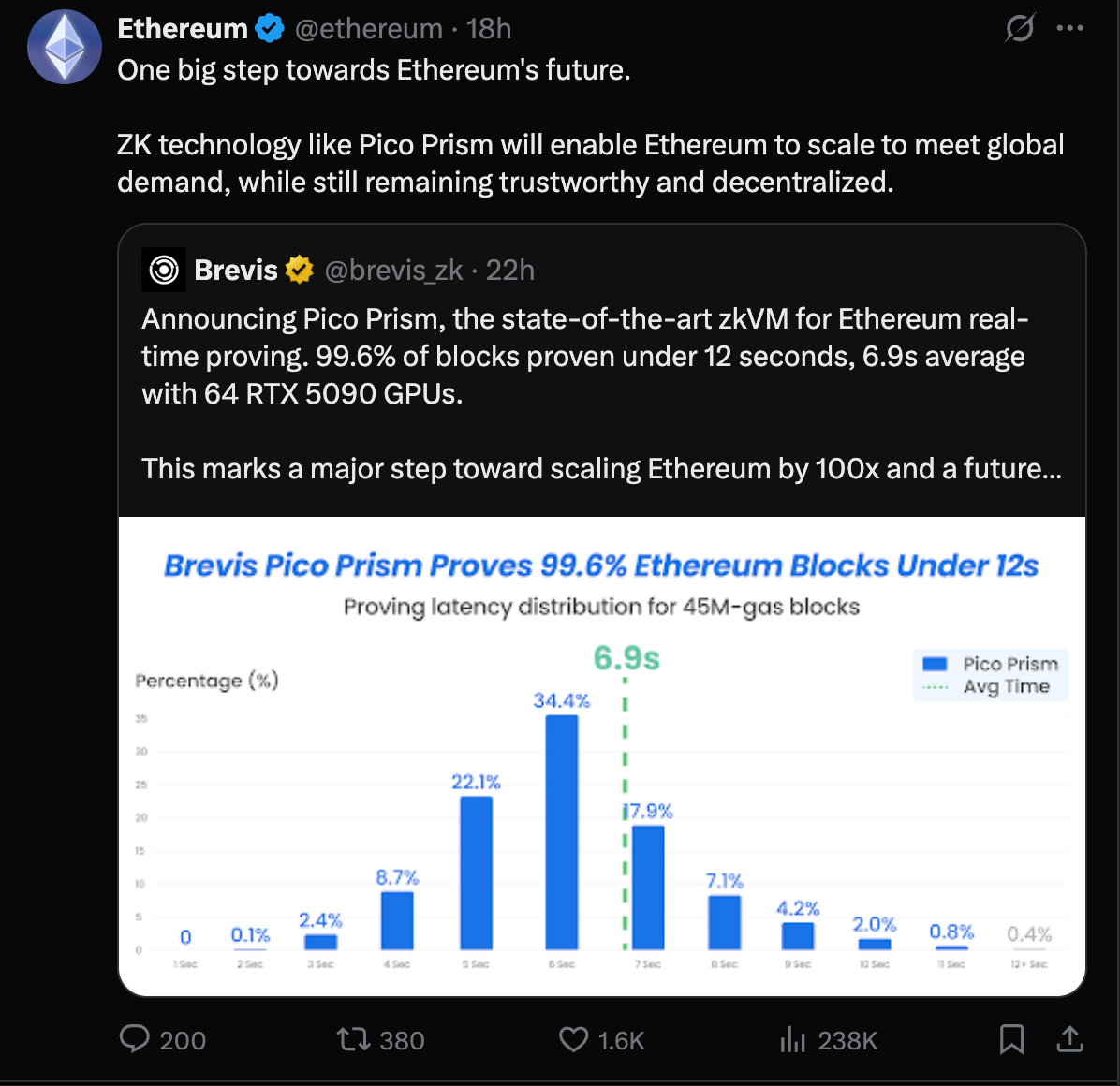 10 月 15 日,Brevis 对外官宣了项目的最新进展——推出用于以太坊实时证明的、最先进的 zkVM Pico Prism。