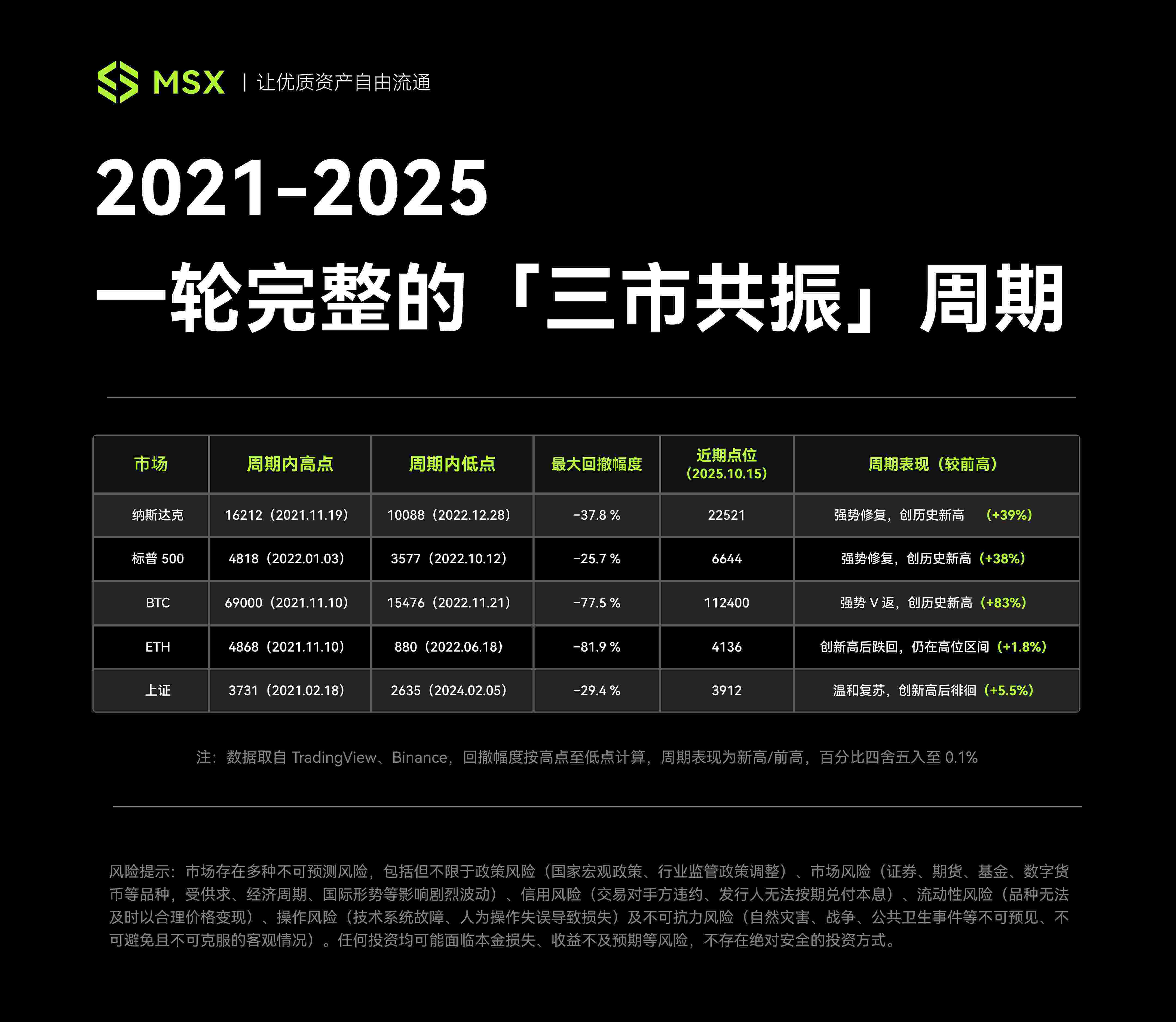 因为这并非寻常的牛熊转换,而是一次罕见的「三市共振周期」:全球流动性从极度宽松转向急速紧缩,再重新回归平稳,在这场剧烈的宏观变奏中,无论是新兴的 Crypto,还是成熟的美股与 A 股,都经历了从「繁荣 → 出清 → 修复」的完整三幕剧。