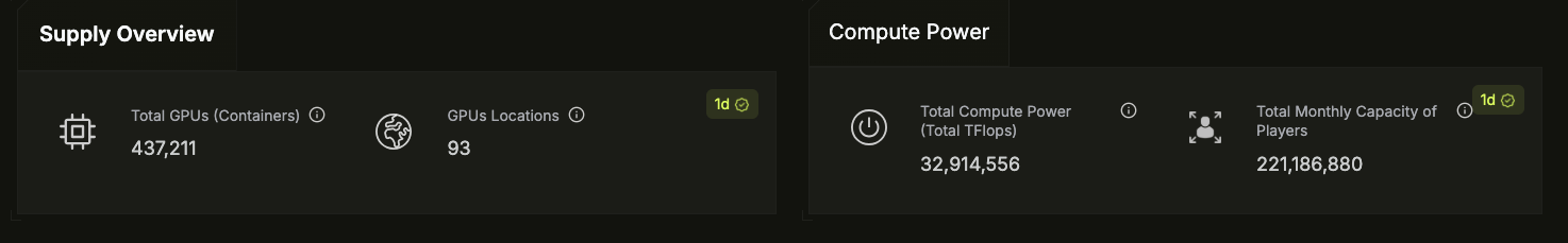 同时,根据 Aethir 的 GPU Dashboard 数据 ,Aethir 的分布式 GPU 云算力达 32,914,556 TFlops,相当于拥有超 49 万张 NVIDIA H 100,价值超数百亿美元。单论可用 GPU 规模,Aethir 已经能于全球少数几家能做大规模 LLM 训练与大并发推理的巨头媲美,跻身“全球顶尖企业级”算力行列。
