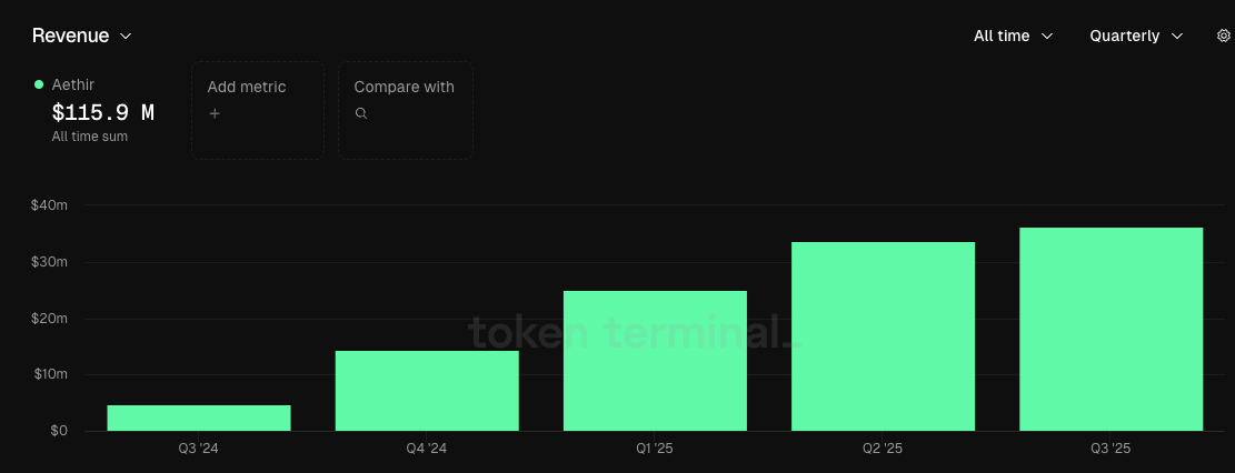 虽然今年 Web 3 的叙事热点已经转向了 DAT 和 RWA,但 Aethir 依然交出了强劲的营收成绩单。 Aethir 2025 年 Q 3 营收突破 3,980 万美元,环比增长 22%,月均营收达 1329 万美元,创下公司历史新高,营收/市值比 14.46%(行业均值:8–23%)。