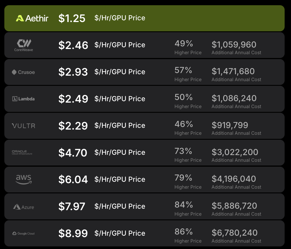 Aethir 真正的业务竞争对手是 Web 2 的中心化计算和云服务企业,而其最大的优势便是具有竞争力的定价,“ 举个例子,现在,像我们平台上的价格,与 AWS 的价格相比,大约是 AWS 的 1/10 ”。如下图所示,Aethir 的每小时 GPU 报价虽然要明显低于谷歌、AWS 和 Oracle,但其同样具备大规模 LLM 训练和云游戏渲染的企业级计算资源条件。