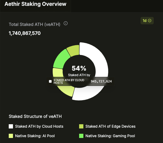 Aethir 网络 GPU 算力扩展,也就意味着会有更多 Aethir 被质押。根据 Aethir 的 GPU Dashboard 数据 ,目前已有超 17.4 枚 ATH 被质押,其中云主机占比其中 54%。